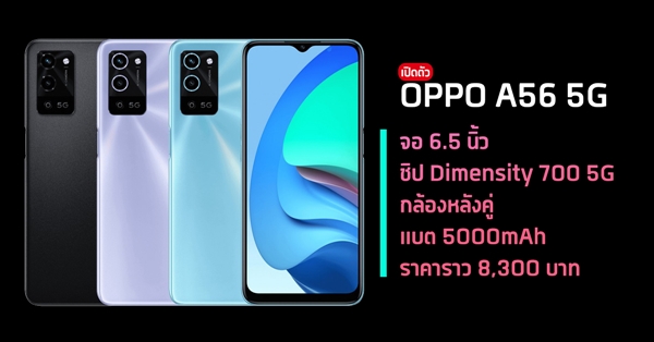 ล่าสุดนี้ทาง OPPO ได้ทำการเปิดตัวสมาร์ทโฟน A Series รุ่นใหม่อย่าง OPPO A56 5G ในประเทศจีนให้เห็นอย่างเป็นทางการแล้ว โดยมาพร้อมกับจุดเด่นด้านการรองรับ 5G, แบตอึด 5000mAh และชิป Dimensity 700 ในราคาราว 8,300 บาทเท่านั้น